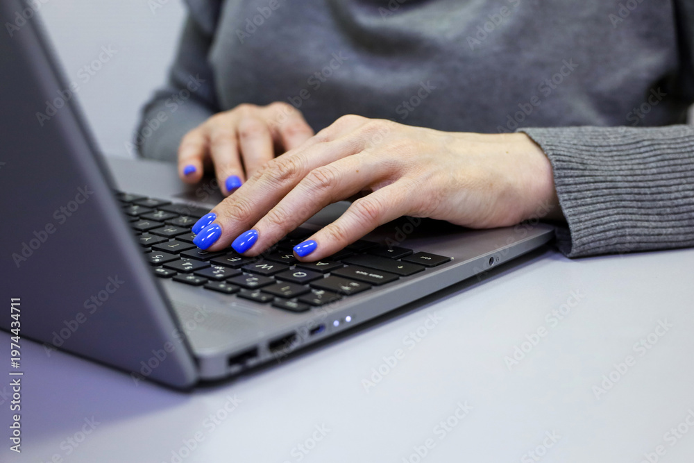 Woman in grey blouse working on the laptop keyboard sitting at table. Female hands with blue manicure #1974434711