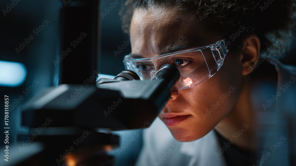 Woman in lab coat and safety glasses looking through a microscope in a dark setting #1788118857
