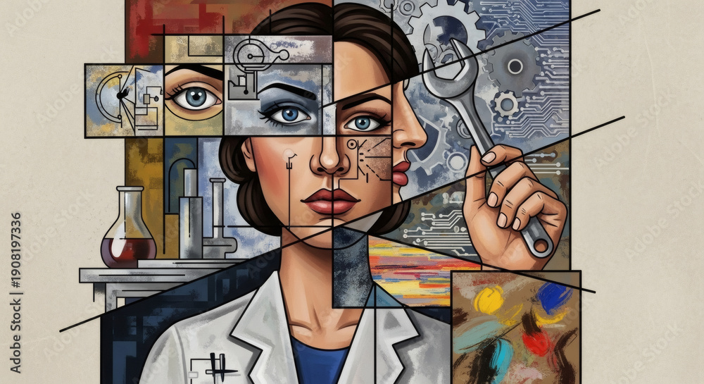 • #1908197336 Woman in Lab Coat Holding Wrench, Surrounded by Science and Art Elements