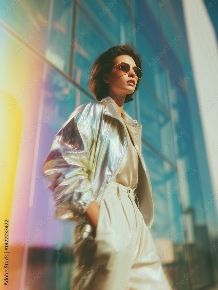 Woman in metallic silver oversized jacket and high-waisted trousers walking confidently on soft pastel blue architectural background, 80s luxury fashion portrait #1972237472