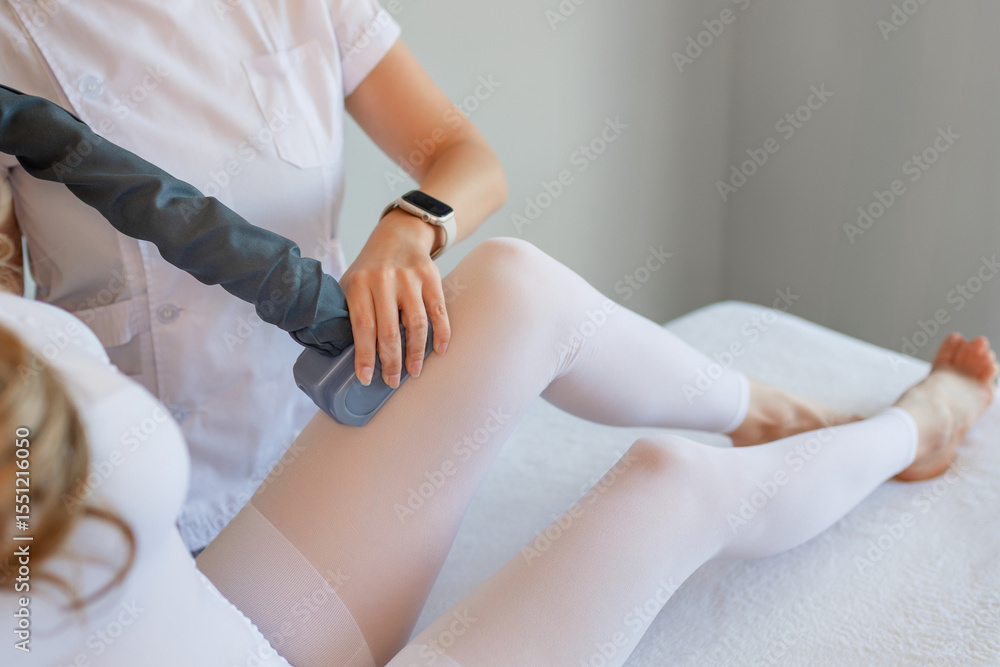 Woman in special white suit getting anti cellulite massage in a spa salon. LPG, and body contouring treatment in clinic.Reset body weight with LPG massage. #1551216050