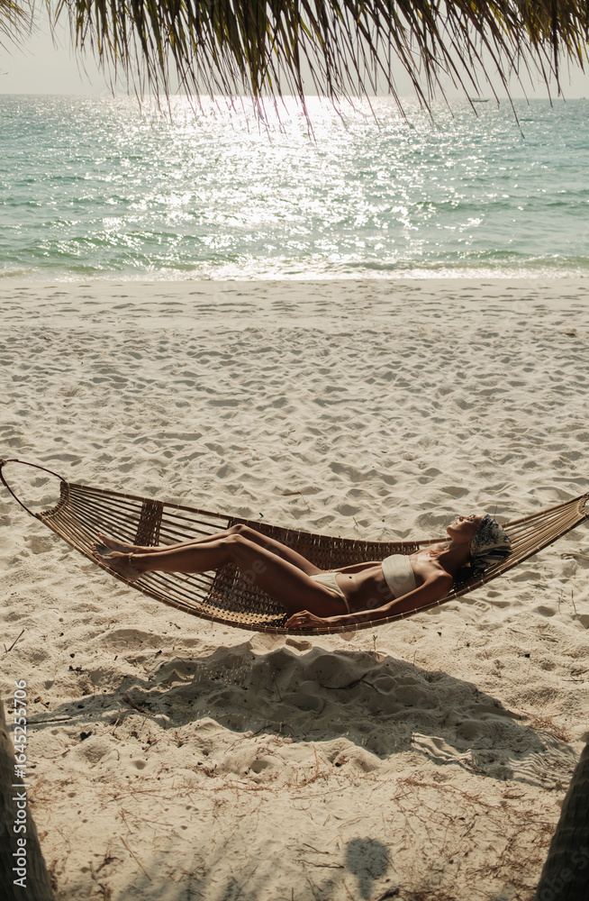 Woman in white bikini lying in a hammock between palm trees on a tropical beach, relaxing by the sea under the sunlight during summer vacation. #1645255706