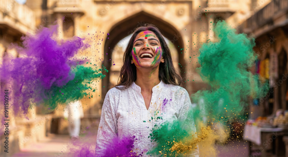 Woman joyfully covered in vibrant colored powder during a holi festival celebration #1911510961