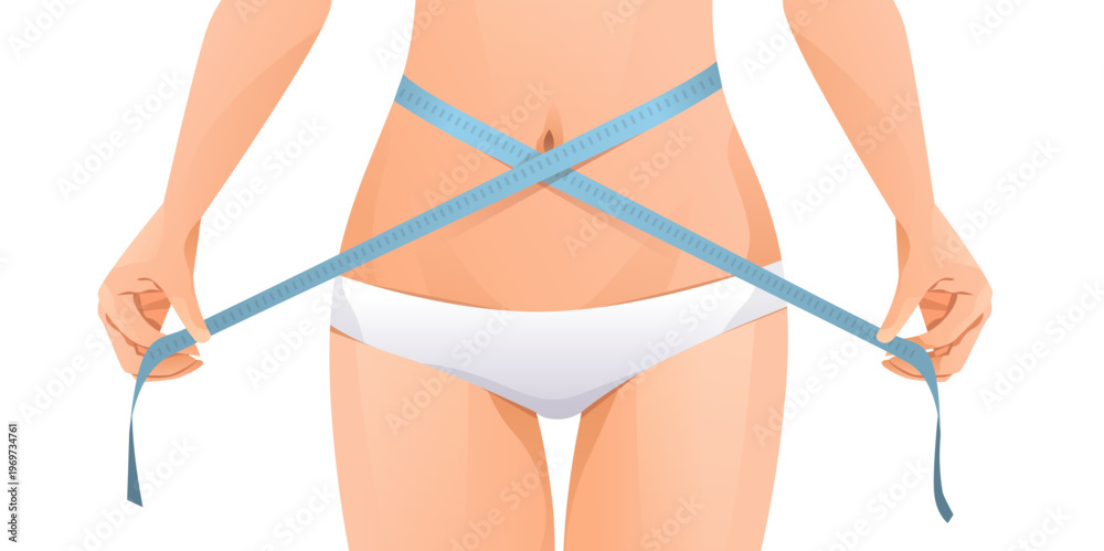 Woman measuring waist fitness body slimming concept female torso in underwear holding tape measure flat style isolated on white background #1969734761