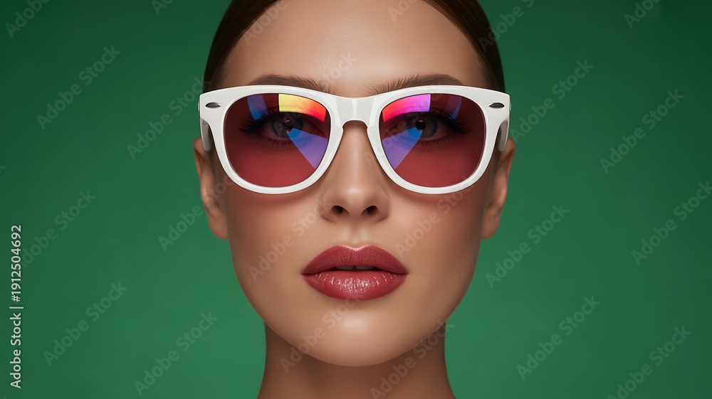 Woman portrait, white sunglasses, reflective red lenses, contemporary fashion, vibrant green background #1912504692