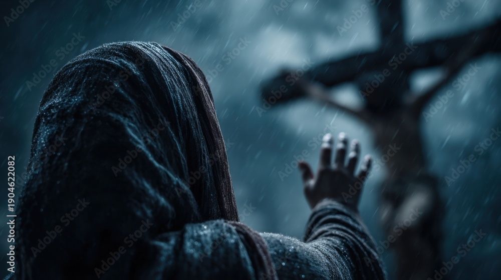 Woman reaching out to the cross in the rain. Religious Passion Week representation and Good Friday. Biblical Christian devotion. #1904622082