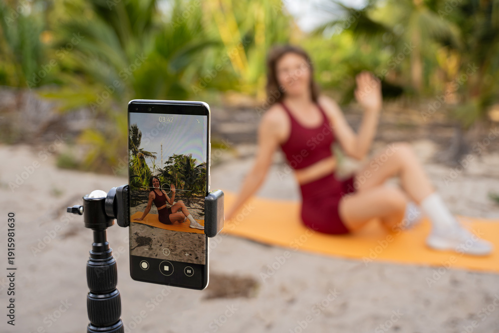 Woman recording online fitness workout on smartphone in tropical outdoor setting #1915981630
