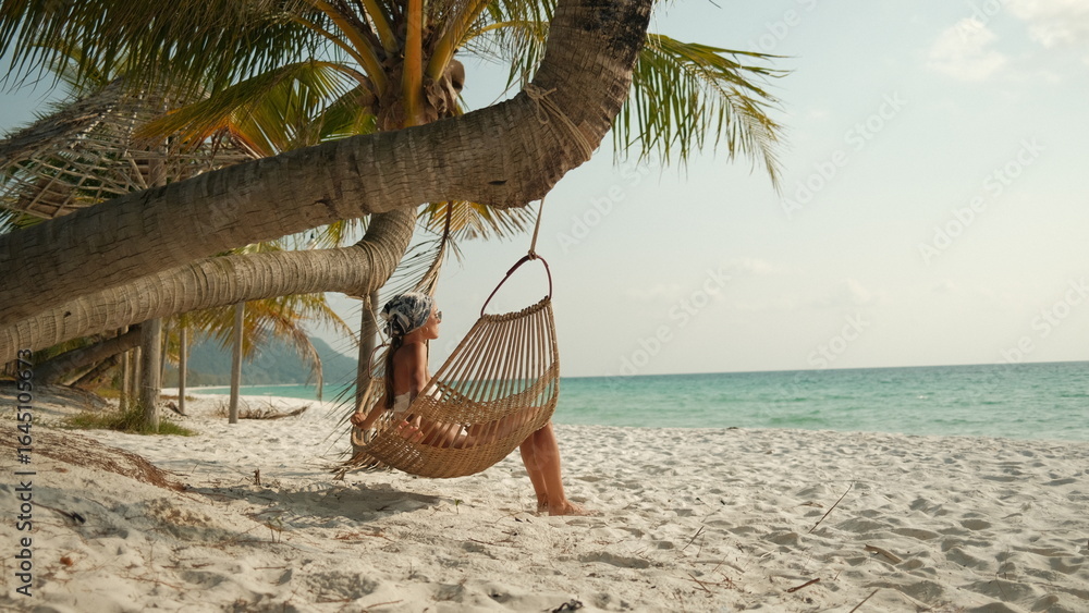 Woman relaxing in a hanging hammock chair under palm trees on a sandy tropical beach, enjoying peaceful seaside vacation and summer lifestyle. #1645105673