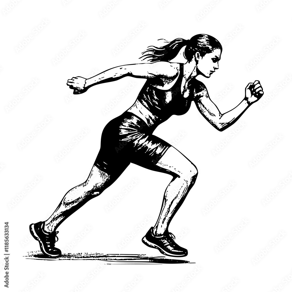woman running sketch engraving black and white outline. Scratch board imitation. #1185633134