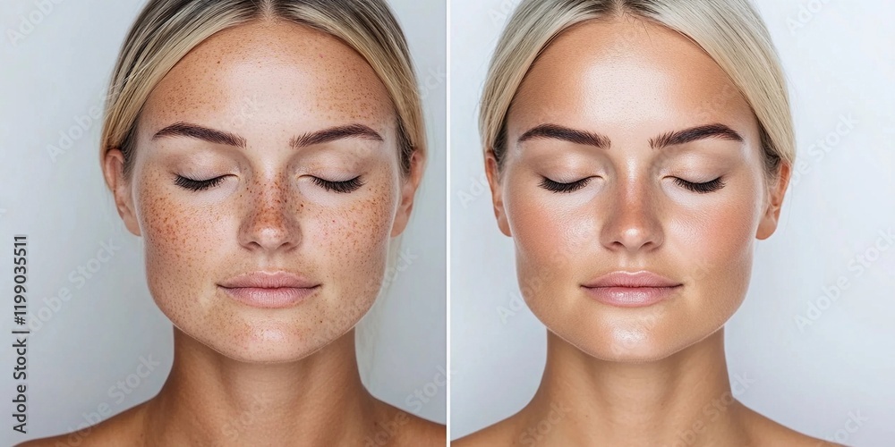 Woman's face before and after skin lightening and pigmentation reduction procedure. Skincare and cosmetic treatment concept. Close-up collage portrait for poster, commercial, design #1199035511