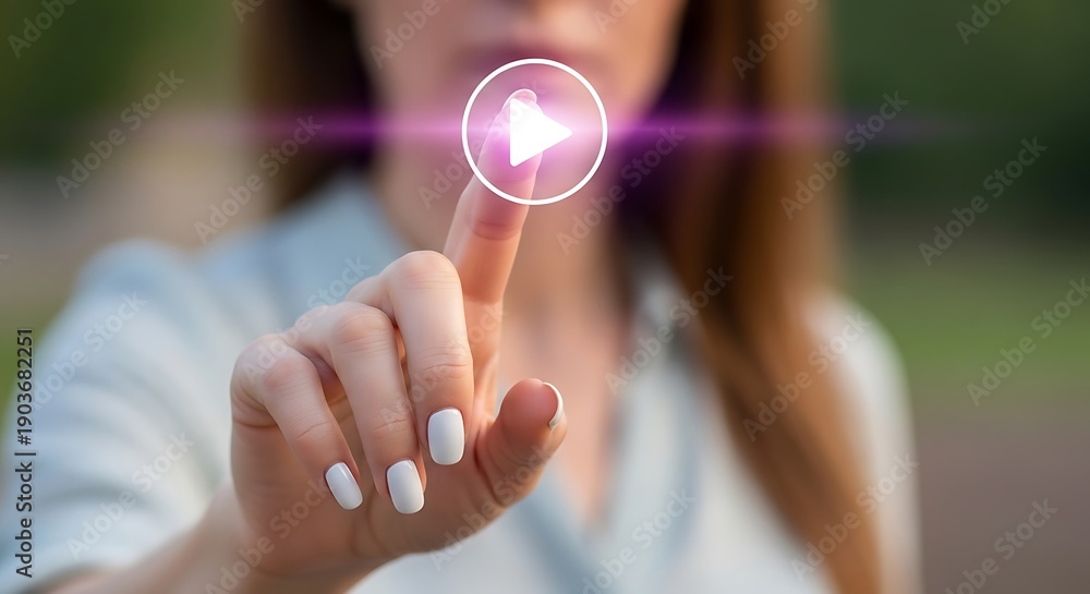 Woman's finger touching a glowing play button icon with a purple glow #1903682251