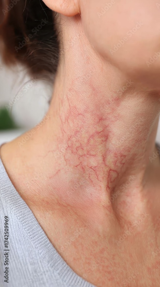 Woman's neck showing telangiectasias, visible spider veins on skin, rosacea affecting capillaries, dermatology concept, skin condition, vascular lesions, medical issue #1742509969
