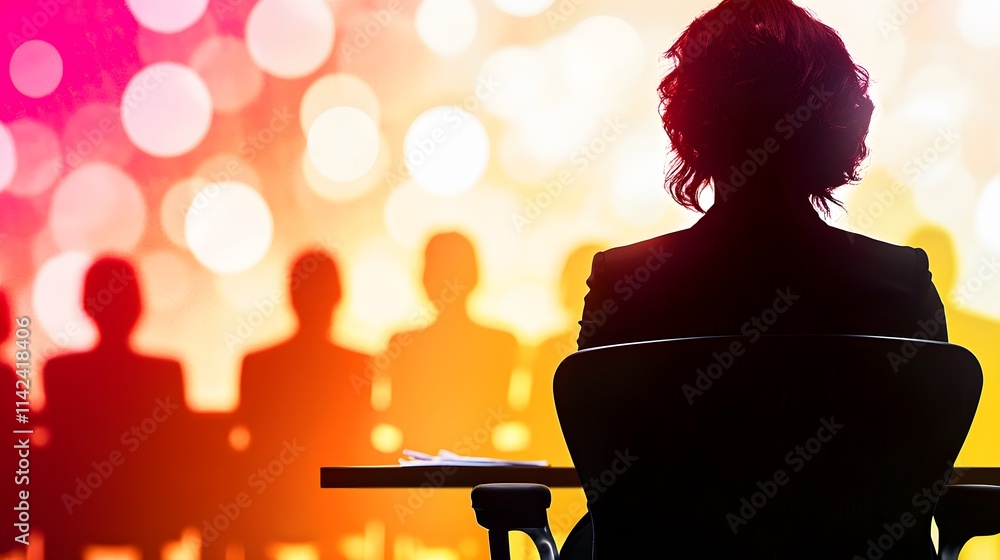 woman sitting in a meeting room, with salary discrepancy numbers subtly blended into the background. The visual reflects her role in a corporate setting while highlighting the persistent issue #1142418406