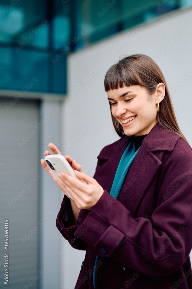 Woman smiling, holding a smartphone, and engaging with digital communication outdoors with an urban background #1957068115