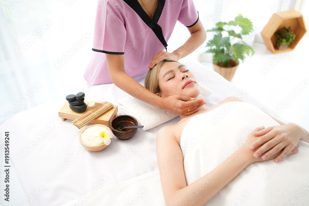 Woman spa body and face treatment and massage aroma therapy product relax and healthy and beauty. Spa Thai therapy treatment aromatherapy for body and face. Young woman enjoying and relax #1913549241