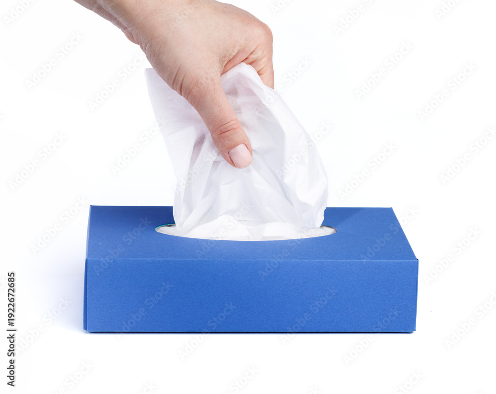 Woman taking paper tissue from a blue box on isolated white background #1922672685