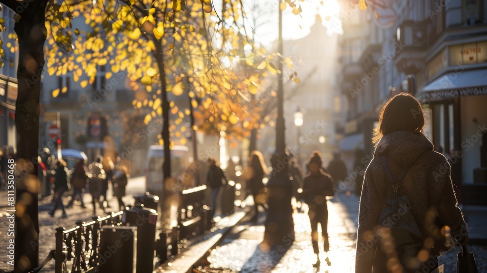 Woman walking through a sunlit urban street at sunset. Cityscape illuminated with golden light. Concept of urban life, city walking, tranquil moments, and golden hour beauty. #811350468