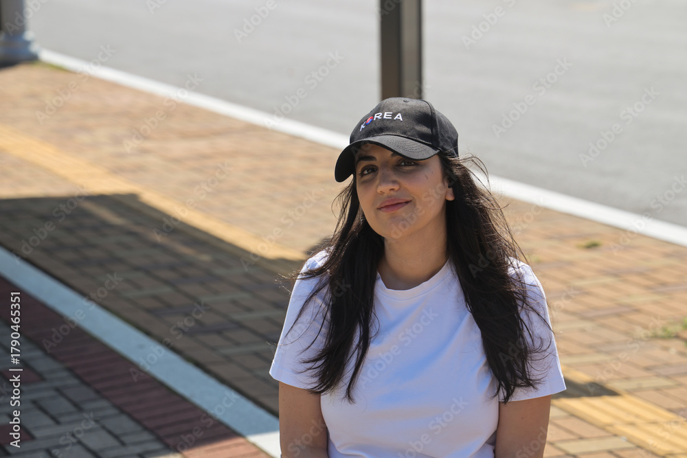 Woman wearing a black cap with Korea text and flag symbol, looking at camera #1790465351