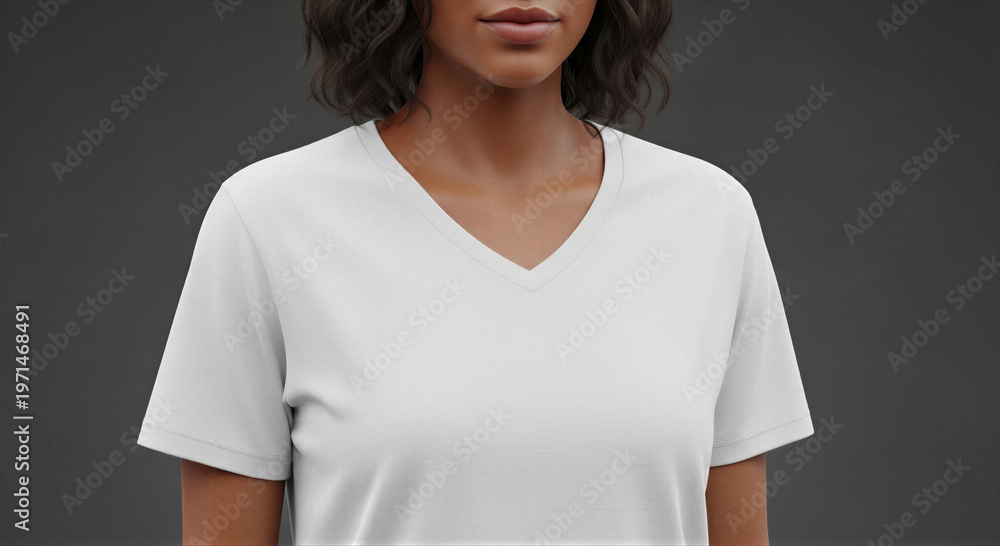 Woman wearing white V-neck t-shirt against dark background #1971468491