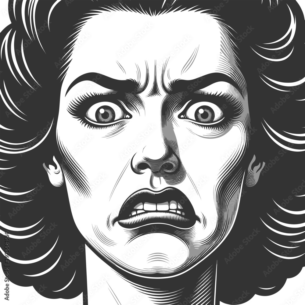 woman with a shocked, fearful facial expression, wide eyes and tense features showing anxiety or surprise sketch engraving generative ai vector illustration. Scratch board imitation. Black and white. #1975581550