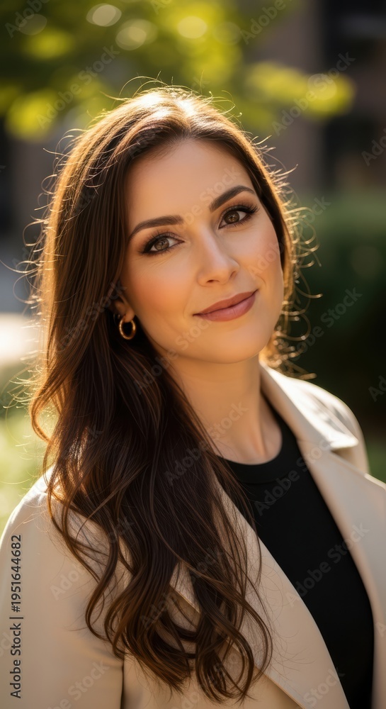 Woman with long brown wavy hair wearing a black and beige jacket #1951644682