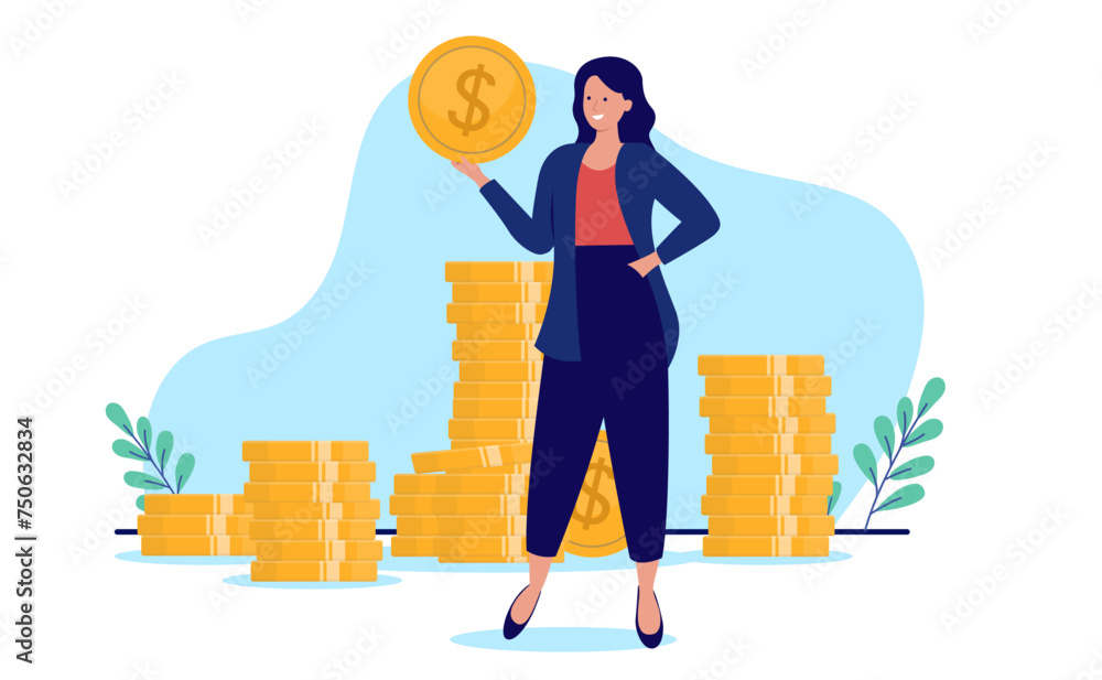 Woman with money - Professional businesswoman standing in front of stack of coins. High salary and income concept in flat design vector illustration with white background #750632834