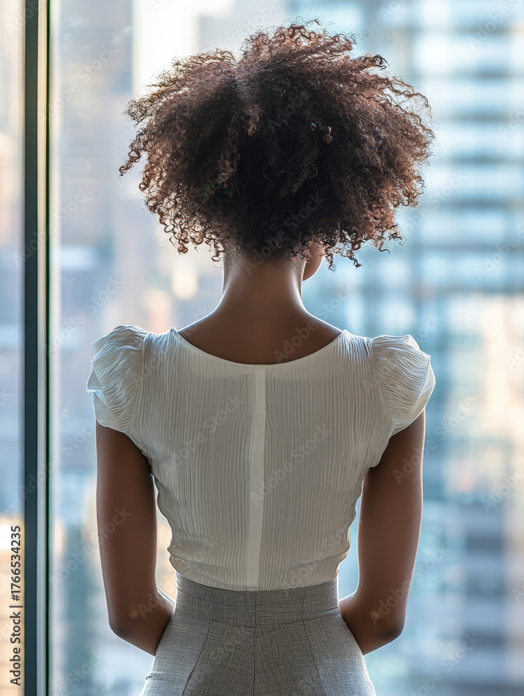Woman with voluminous curly hair gazes out a window at a city skyline. #1766534235