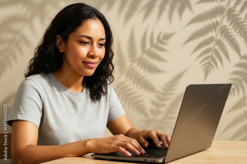 Woman working on laptop with leaf shadows on beige wall in natural light creating calm and creative home office atmosphere. Ai generative #1973460232