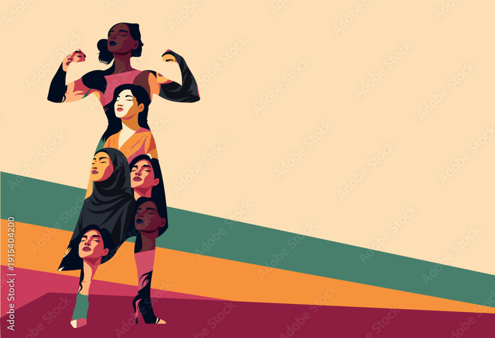 Women's Day, March 8th. Bright vector illustration portraits of diverse women united by strength in a single silhouette. Symbol of unity, equality, feminism, diversity,motivation, women's empowerment #1915404200