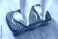 Women's legs stand on a sports vibration platform at home. Concept of doing sports at home. Modern home exercise machine, close-up #1804060500