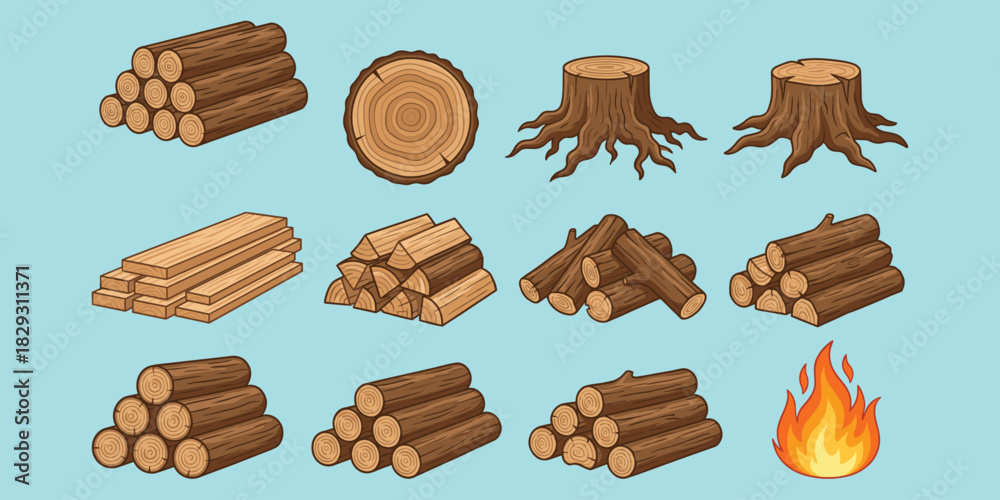 Wood logs, tree stumps, lumber stack, firewood pile, flame icon, forest resources, timber elements, cartoon style, flat vector illustration #1829311371