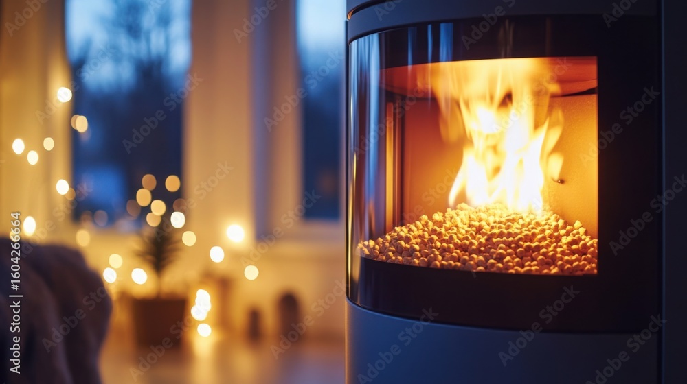 Wood pellet stove with fire burning inside #1604266664