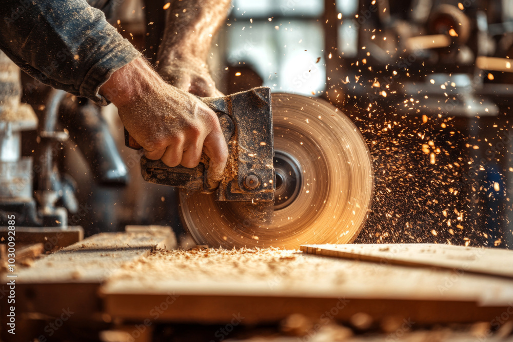 Wood shavings fill the air as a carpenter expertly guides a power tool along a wooden board, showcasing craftsmanship in a well-lit workshop. #1030092885