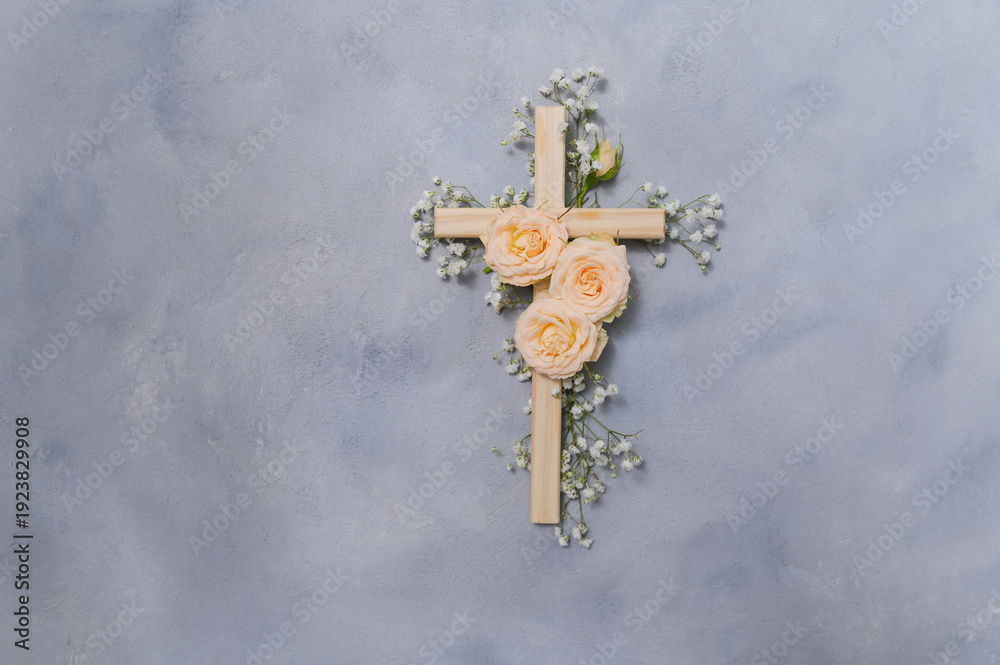Wooden christian cross with pink roses and gypsophila flowers on a dark shadow wall representing faith and easter symbolizing copyspace faith, resurrection #1923829908