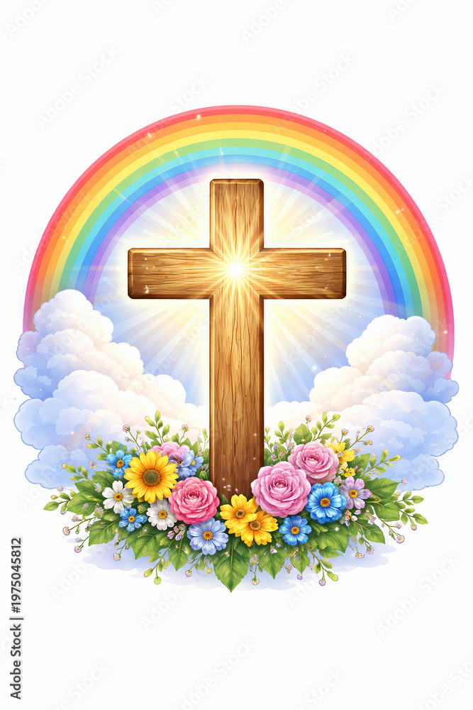 Wooden cross with rainbow, glowing light and colorful flowers, uplifting spiritual scene with hope and faith symbolism #1975045812