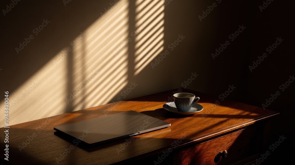 Wooden desk with laptop and coffee cup bathed in warm sunlight #1944420046