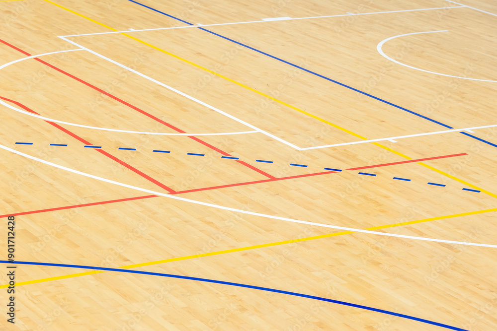 Wooden floor basketball, badminton, futsal, handball, volleyball, football, soccer court. Wooden floor of sports hall with marking lines on wooden floor indoor, gym court #901712428