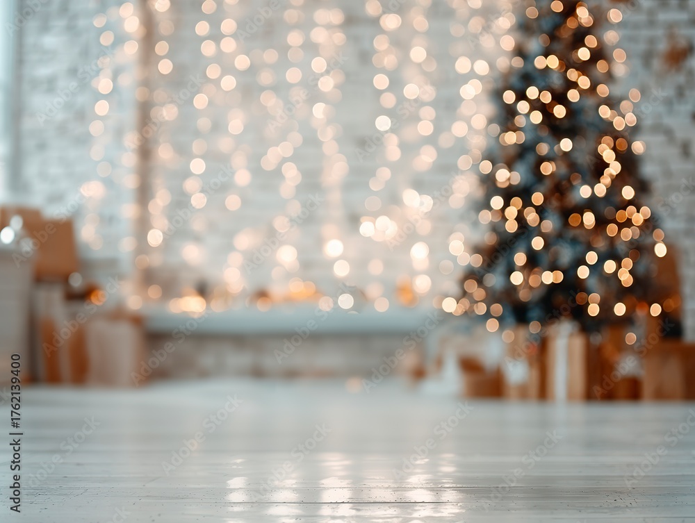 Wooden flooring in a cozy living room with a blurred Christmas tree and sparkling holiday lights in the background. Winter holiday interior, empty space for product display #1762139400