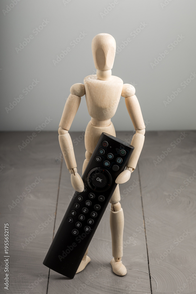 Wooden mannequin holding television remote control, control and modern convenience concept #1955652175