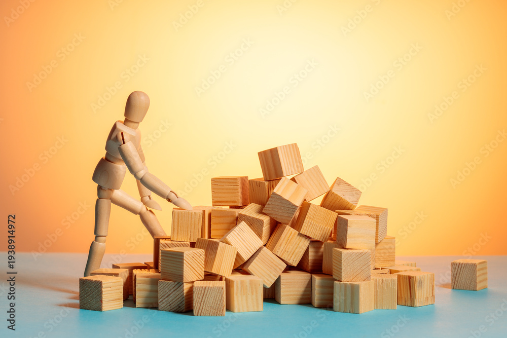 Wooden mannequin looking over scattered wooden blocks, sorting chaos concept #1938914972