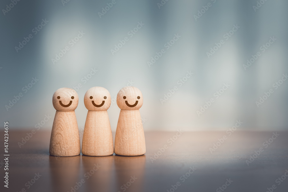 Wooden people with smiley faces on table. Concept of teamwork, leadership, HR, employee satisfaction, business management, and positive workplace culture. #1474234675