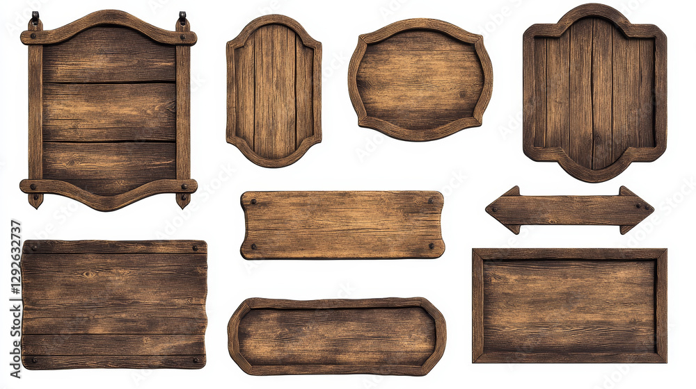 Wooden plaque sign board cartoon vector tag label. Isolated wood signboard set with frame for game interface. Brown rustic plank with timber texture to use as badge or nameplate for announcement. #1292632737