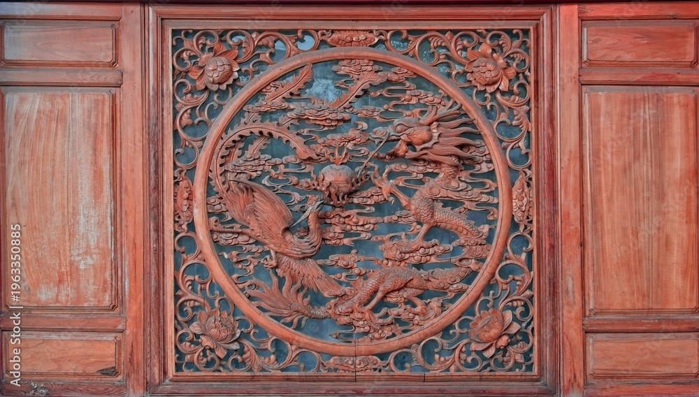 Wooden rustic wood carving depicting mythical dragon and phoenix bird. #1963350885