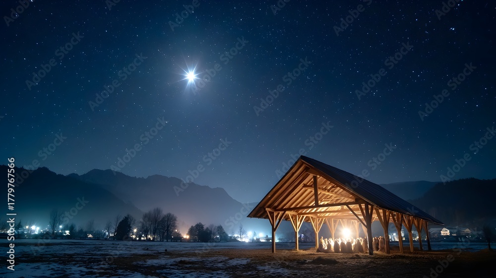 Wooden stable illuminated under a dark blue starry sky with a bright celestial body shining above #1779767566