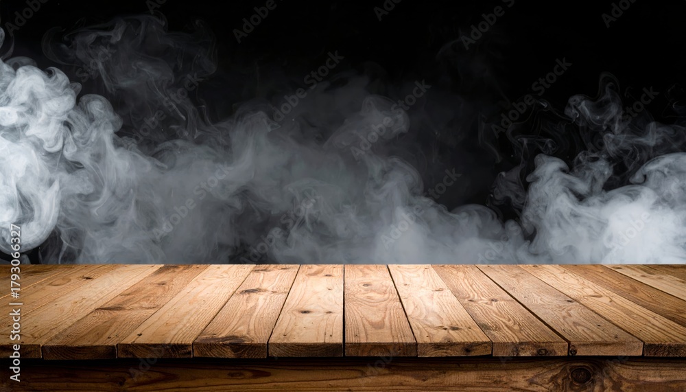 Wooden Tabletop with Smoky Background Horizontal Composition, Dark Mood, Misty Atmosphere, Product Display Keywords Mockup, Background #1793066327