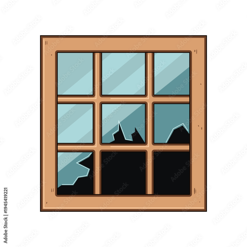 Wooden window frame with multiple shattered and missing glass panes, showing decay, neglect and vandalism, exposed opening in an old rustic facade, damaged and unsafe #1945419221