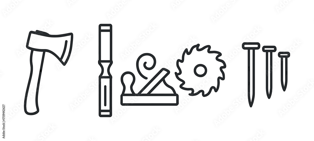 Woodworking tools icons: axe, chisel, plane, saw, nails line art #1709442627