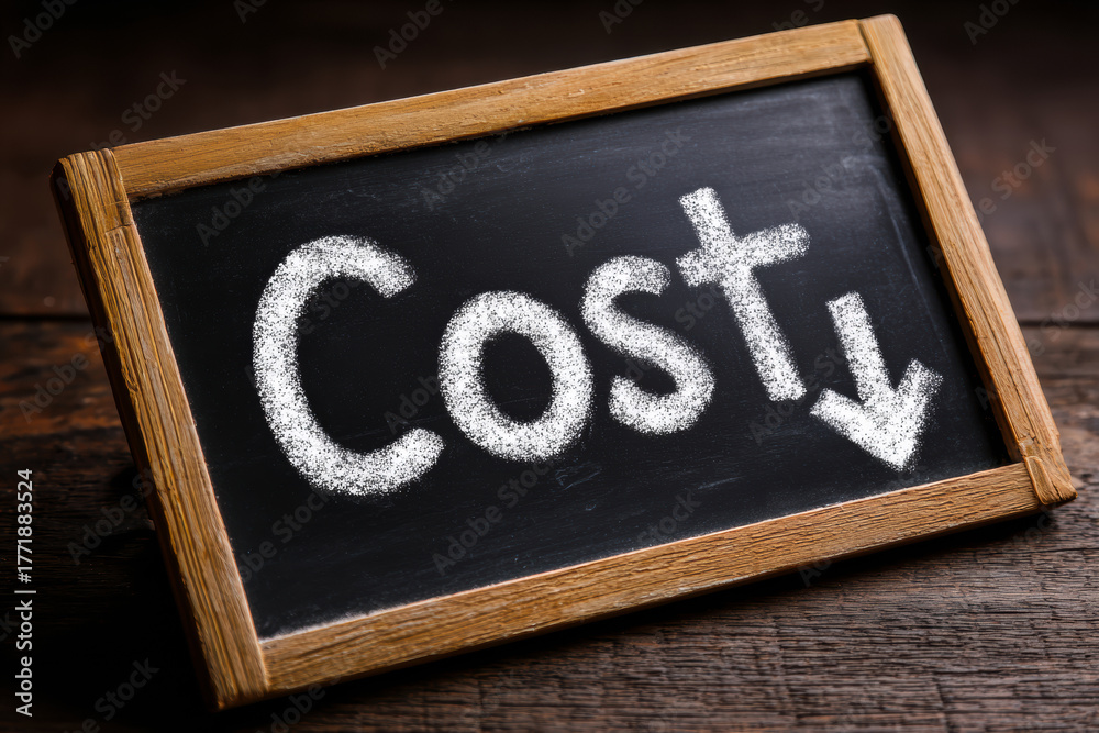 Word cost written in chalk on blackboard with stacked coins, small money bag, and calculator, symbolizing finance, expense, and budgeting concepts. #1771883524