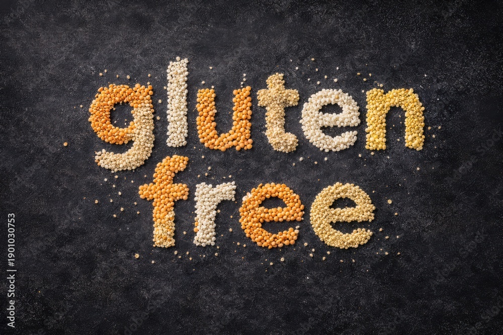 Word “gluten” composed from different grains on dark textured background. Concept of gluten intolerance, celiac disease, healthy nutrition and food awareness #1901030753