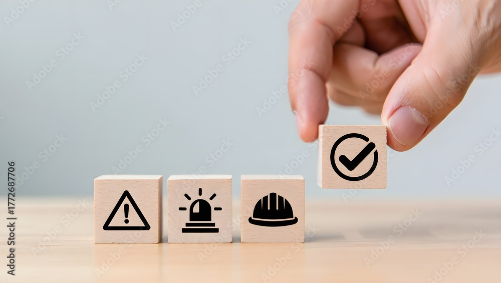 Work safety and compliance concept. Wooden cube blocks with icon of safety at workplace. Safety first, protections, health, regulations and compliance. Safety in working process. Zero accidents. #1772687706